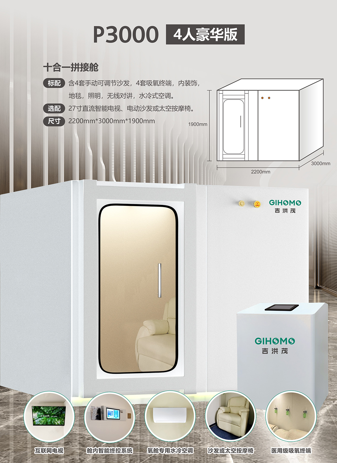 标配:含4套手动可调节沙发,4套吸氧终端,内装饰,地毯,照明,无线对讲,水冷式空调