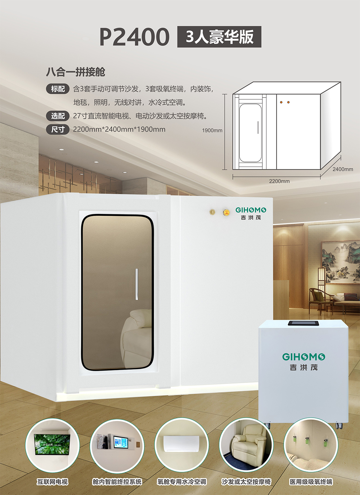标配:含3套手动可调节沙发,3套吸氧终端,内装饰地毯,照明,无线对讲,水冷式空调。