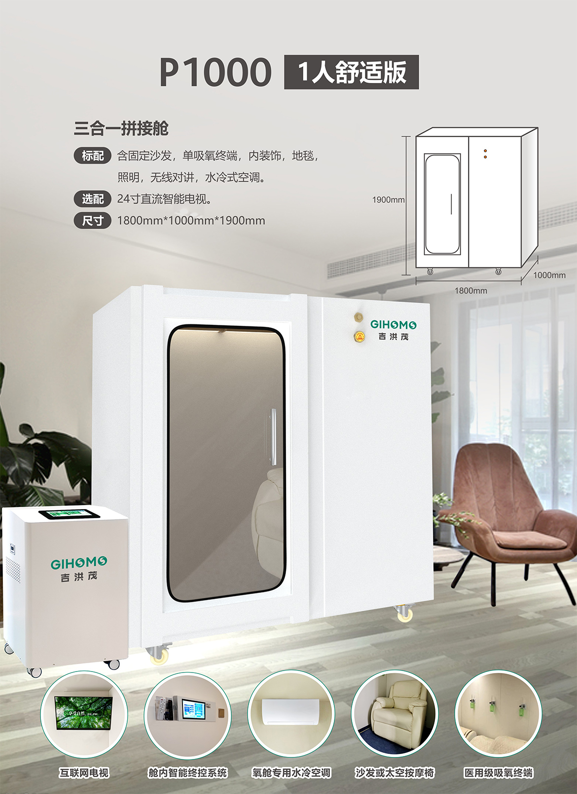 标配:含固定沙发,单吸氧终端,内装饰,地毯,照明,无线对讲,水冷式空调